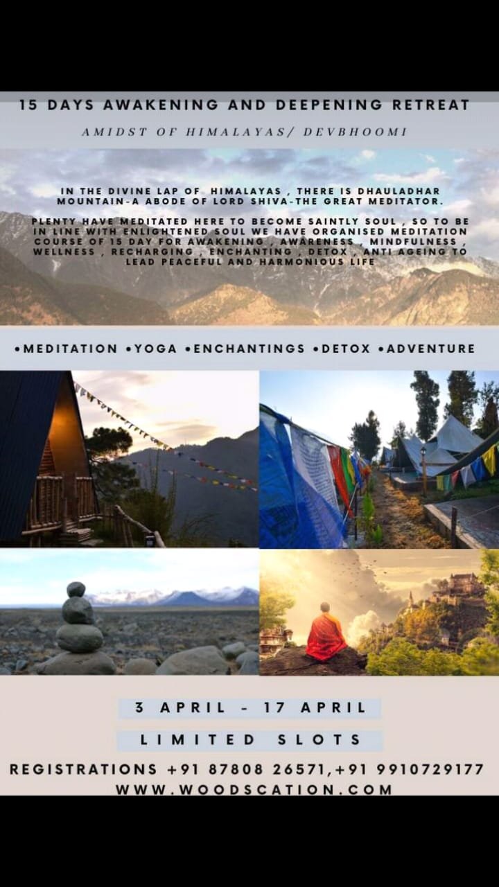 Meditation course organized at Himalayas. In the divine lap of Himalayas, there is Dhauladhar Mountain is abode of Lord Shiva the great meditator. Plenty have meditated here and upgraded themselves to become saintly soul, so to be in line with enlightened soul we have organized meditation course of 15 day for awakening, awareness, mindfulness, wellness, recharging, enchanting, detox, anti-ageing to lead peaceful and harmonious life. L I M I T E D S L O T S
